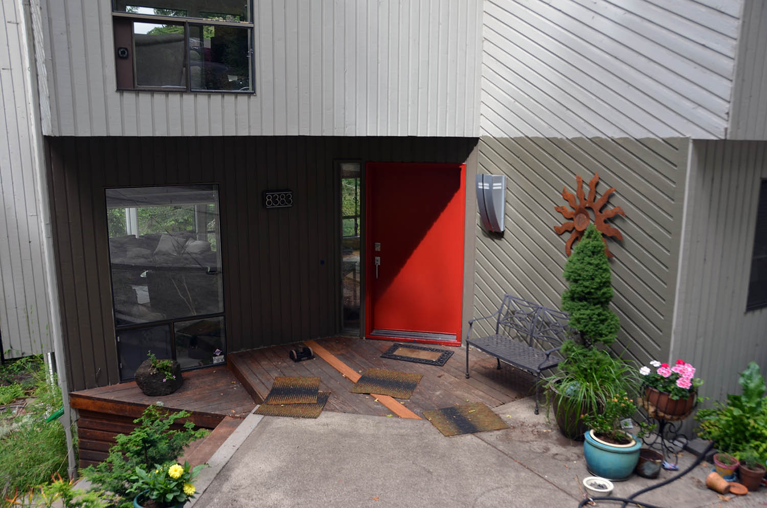 | So we have to repaint the outside of our house. It is currently a somewhat dull light grey but more importantly, it needs new paint. But before we do that, the siding needs to be repaired or possibly replaced, a much more complicated and expensive task since the house has 5,044 square feet of exterior surface over 44 separate facets. But we are discovering an even more challenging task—picking a new color. The house will be a single color as it is now since the architectural style, seventies Pacific Northwest, doesn’t have window trim or the structure for two-tone or accents. We are also replacing the front door (dry rot at the bottom) so this is the only place where we can add a color statement. The good news is that Karen and I seem to be aligning on the color direction. Early candidates were in the brown, beige, olive flavor. Now we are settling in to taupe. Why be different than 80% of the houses out there! But what hue or lightness? As we look at houses, some seem too light, some too dark, some too brown, some too grey, some too green even though you could call all of them “taupe”. Of course color perception is dependent on the lighting, nearby colors, and other factors. When we do see a house we like, just try to remember that shade when you go to a paint store and try to pick that color from the swatch samples from the rack of hundreds of color chips that all look like “taupe”. It is even difficult to pick a matching color chip on the rack when you are holding a sample color. And we have heard so many times of homeowners carefully choosing a color from a color chart but then after the house is painted being unhappy and thinking the actual color is much darker/lighter/browner/greener/bluer/greyer than they thought it would be. So we are spending time to make the choice. We have looked at many houses and matched good candidates to a color swatch. I have built a 3D model of our house in the CAD program SketchUp so I can simulate colors. This program also lets me add sunlight and shadows to render a more realistic image. To get an even more realistic appraisal, we are painting the current door and the front of the house around the door with candidate colors so we can see what it might look like in a real-world setting. We have two door styles, two door color candidates, and now at least three flavors of taupe for the siding. Take a look at our mockups and let us know what you think. We currently have all the choices in the CAD model renderings so far the blue and red door and the first taupe siding physical sample. We have had lots of feedback since our initial posting; thanks everyone for your feedback and suggestions, good input. I have now added several more pictures including renderings with all of the door colors suggested. These definitely made us think more about the door color. I have rendered the door color samples in my CAD model with the sun and shadows turned on for mid-day to try to show how this lighting affects the color tone. And of course, I may not have chosen the orange/turquoise/purple/teal/green shade you had in mind. I have also now painted the siding around the door with the taupe we had settled on so I have pictures of the blue door with this taupe sample and now also the red door against the taupe. After painting the taupe, it seemed much lighter than I had thought, imagine that. In some lighting, it doesn’t look that much darker or different than the current blah grey and does seem lighter than the taupe I mixed for my CAD model, despite an effort to match the color switch I had. Karen likes this first taupe sample just fine, I’m not yet sure. While this color test exercise is interesting, it is showing how important it is to do this. We have been surprised at every result. Karen was sure she wanted the red until I painted the door that exact color. Some of the suggested colors that we may not have initially selected to test are starting to look interesting. Good thing that we have the time to mess around with this and over-think it. |