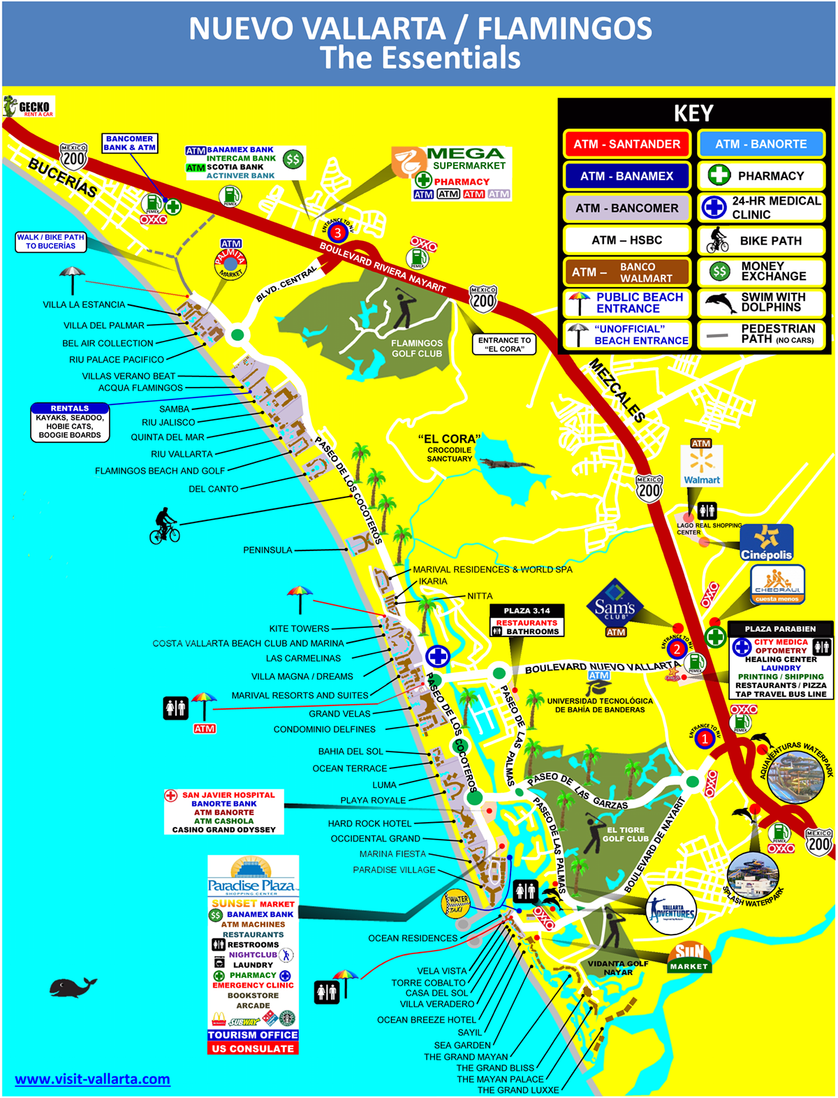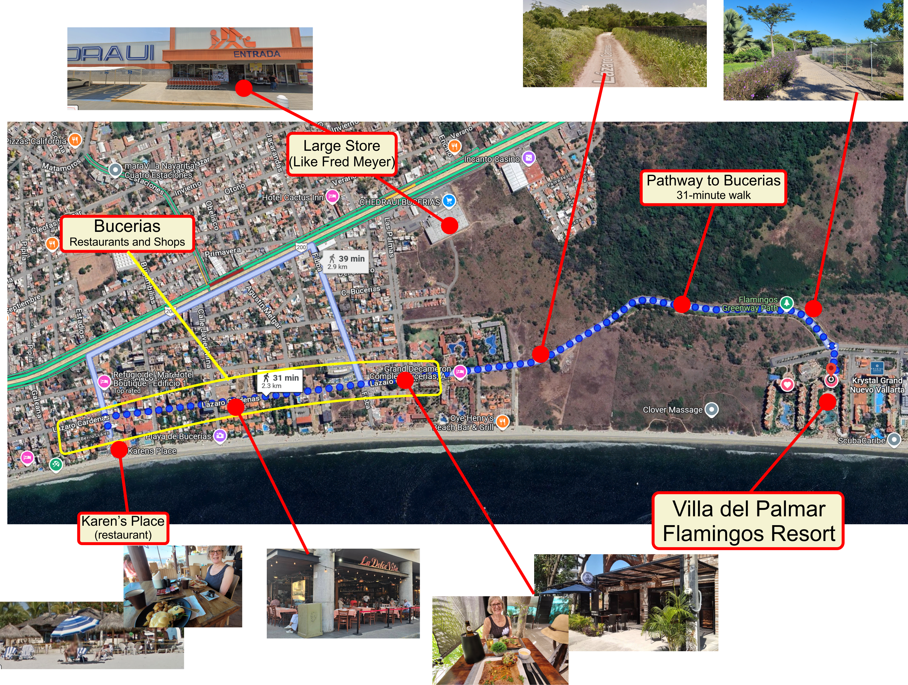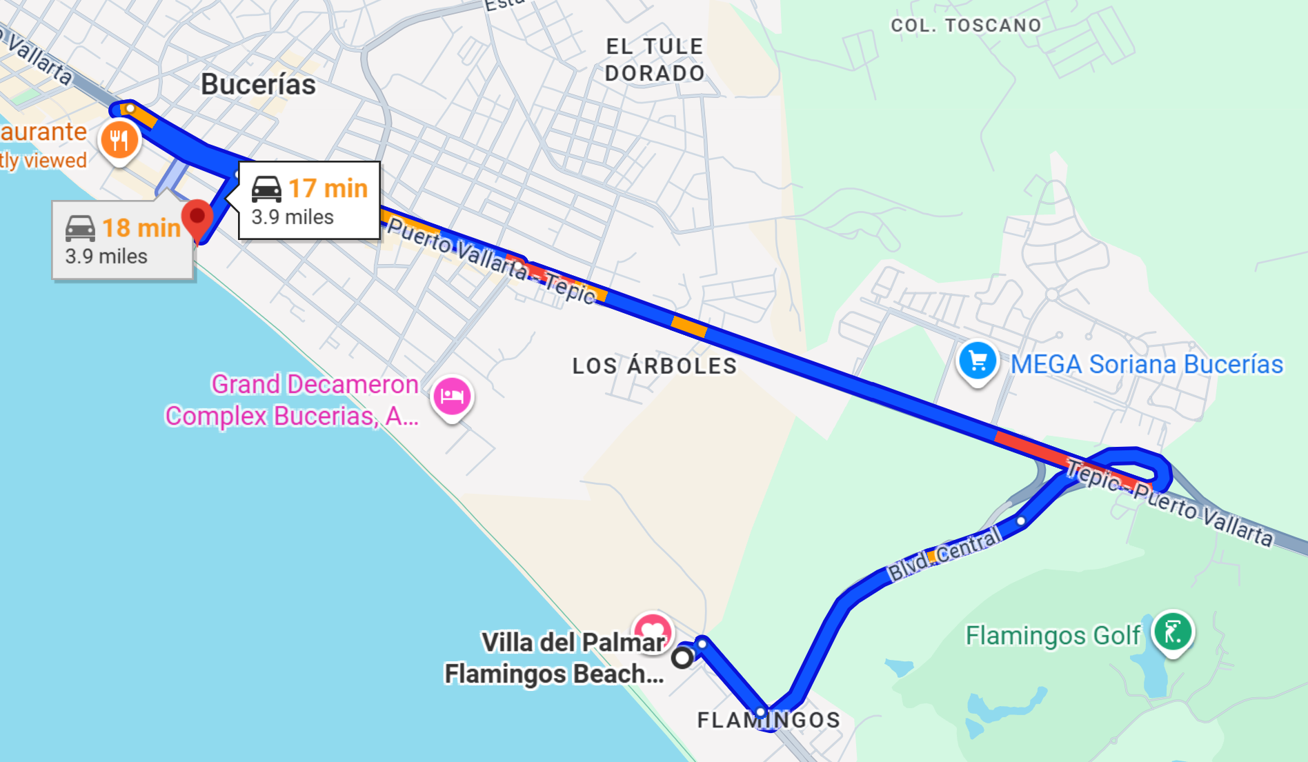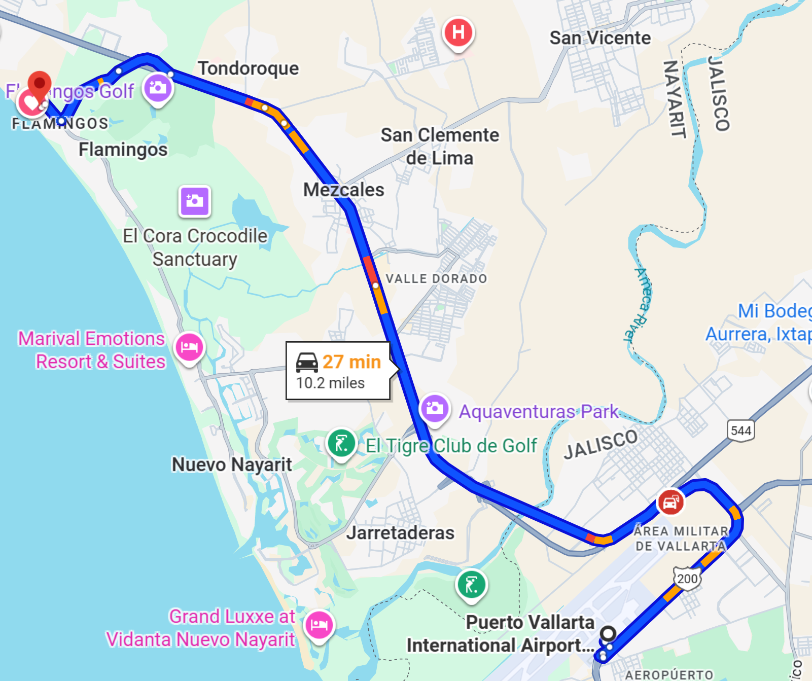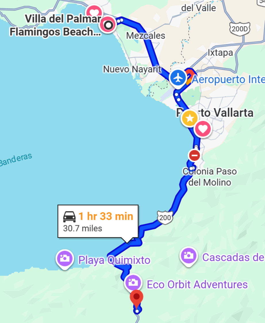 Airport to Flamingos Resort: 10miles/27mins Flamingos Resort to Puerto Vallarta Malecon area: 15miles/46mins Flamingos Resort to Bucherias town: 4miles/17min Flamingos Resort to Botanican Gardens: 31miles/1hr-33min