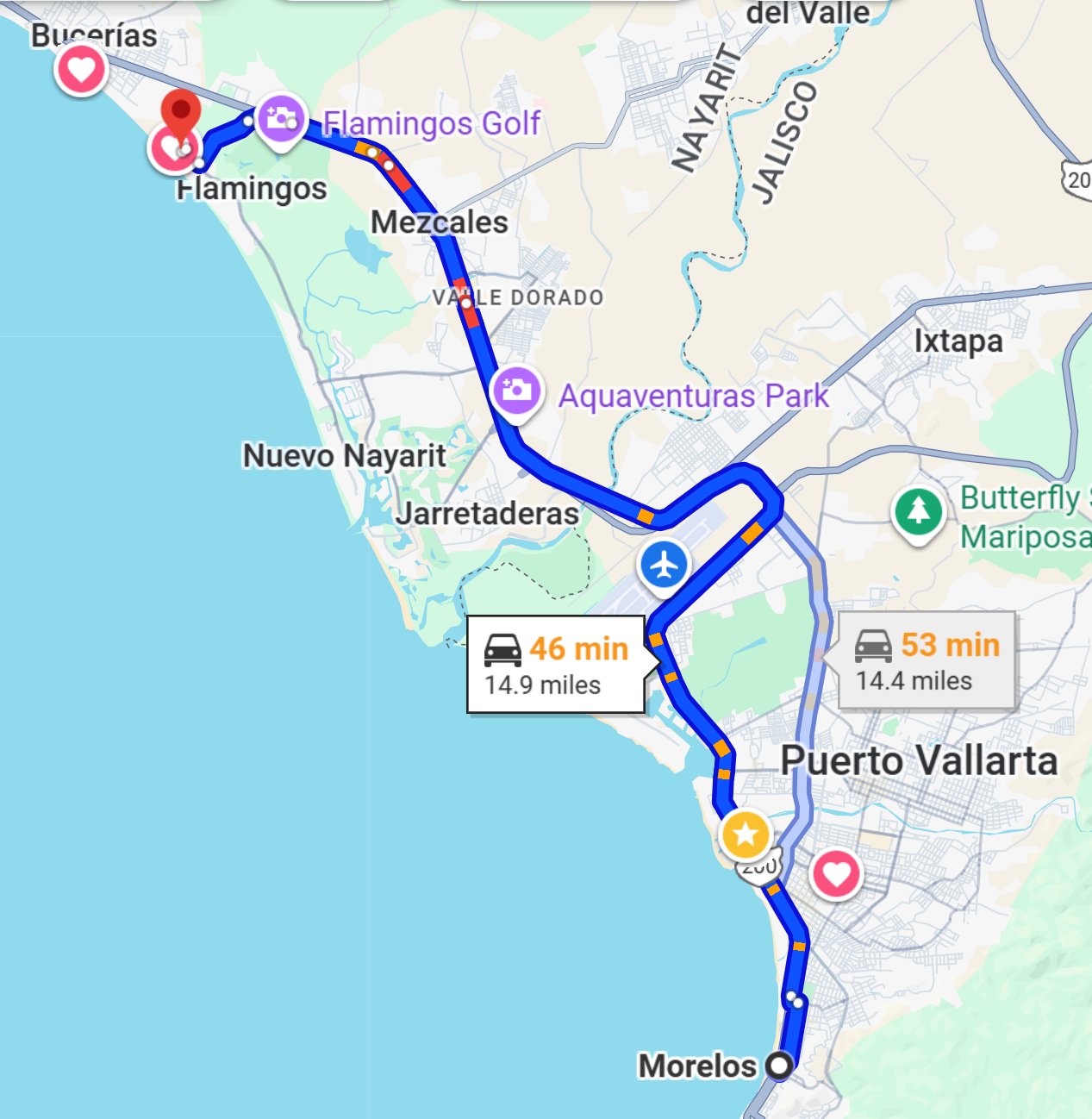Flamingos Resort to Puerto Vallarta Malecon area: 15miles/46mins