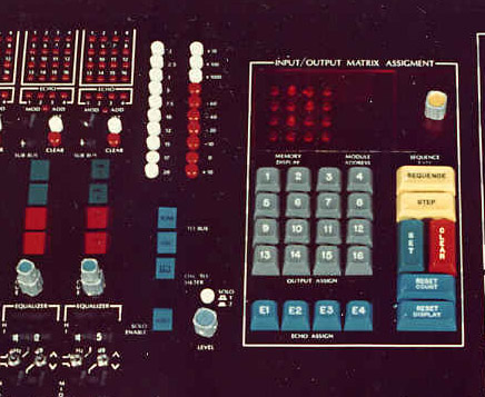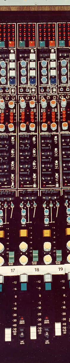 SubmastersUp until that time, mixing console signal paths were straightforward: each input could be switched to one or perhaps more than one output channel. Each output channel went to one track of the multi-track recorder. Submaster faders were gain controls of the output channels. On earlier consoles, with only four or less output channels, a master fader controlling the gain of all the output channels was possible. But there were no 16- channel faders, so there were no master faders on large consoles. Jones recalls; "If you used several mics on a group of instruments, perhaps strings or drums, you could assign them to individual tracks to give flexibility during the mix down. If you chose adjacent output channels, the submaster faders would also be adjacent but there were as many of these as output channels. With VCAs, the input gain was set by a DC control voltage, so it was possible to control this DC voltage in various ways by simply grouping faders. Now there was no requirement to hard-map the relationship between output channel and submaster faders. You could have five mics on the drums going to five tape tracks respectively, but all controlled by a single group fader. You could assign level control completely independently from channel and tape track assignment. This was perhaps the most difficult new feature to explain of the system to prospective customers. I recall many times trying to explain this to someone at an AES convention only to have their eyes glaze over. Every once in a while, someone would suddenly get it and their eyes would light up as they realized what this meant and the advantages it would provide."